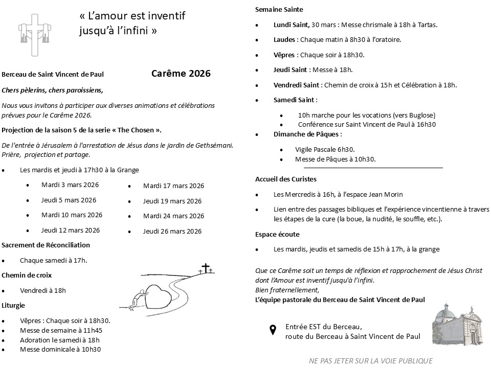 •La messe est célébrée, du lundi au samedi, à 11h45 (à l’Oratoire situé derrière la Chapelle).